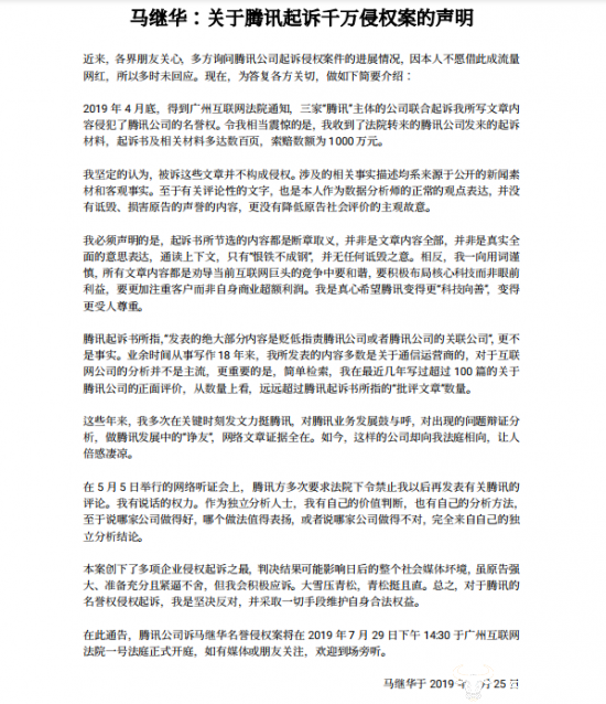 7月25日,自媒体人马继华正面回应了关于腾讯起诉千万侵权案的声明。马继华坦言对于腾讯的名誉权侵权起诉,他会积极应诉并表示坚决反对,还会采取一切手段维护自身合法权益。