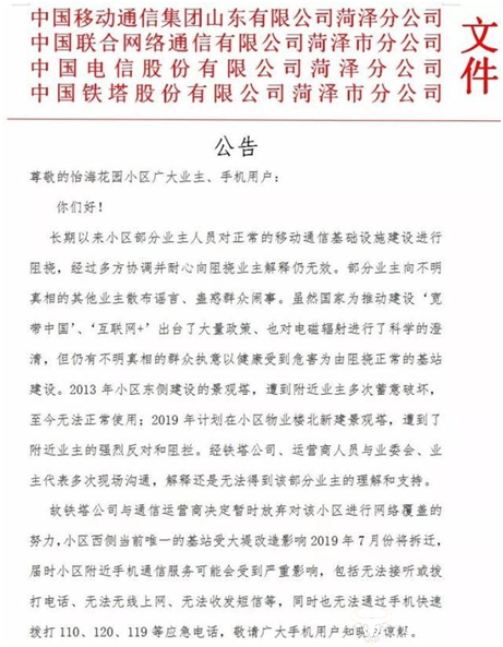 7月26日,运营商财经网获悉,山东怡海花园小区部分业主多次以健康受到危害为由阻挠正常的基站建设,目前中国移动、中国电信、中国联通以及中国铁塔联合发布通知,将暂停对该小区居民的通信网络服务,届时也无法通过手机快速拨打110、120、119等应急电话。