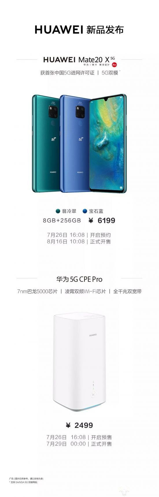 7月26日,华为正式发布旗下首款中国上市5G手机华为Mate 20 X 5G,官方售价为6199元(8GB+256GB),即刻起,中国联通全国各大营业厅及10010官网同步启动预约(可点击“阅读原文”预约),8月16日10:08中国联通线上线下各渠道即可开售。除了首款商用手机,华为还发布了一款5G路由产品——华为5G CPE Pro,售价2499元。它并不是传统意义上的路由器,因为不仅具备家用路由器的全部功能,还可以将4G/5G信号与光纤宽带结合在一起,进行双重加速。