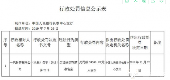 日前,中国人民银行长春中兴支行公布了对一汽财务有限公司(以下简称一汽财务公司)的行政处罚信息,称其去年欠缴法定存款准备金并处罚金3.43万元。作为一汽最有钱的财务公司,为何连存款准备金都没缴,究竟是故意还是真的另有隐情?