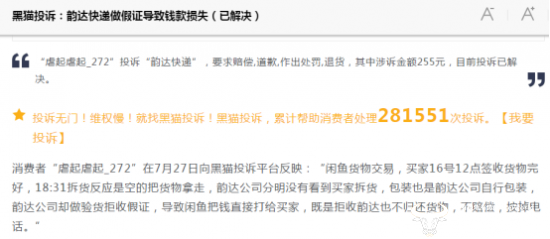 无独有偶,7月27日有用户在某投诉平台反映:“闲鱼货物交易,买家16号12点签收货物完好,18:31拆货反应是空的把货物拿走,韵达公司分明没有看到买家拆货,包装也是韵达公司自行包装,韵达公司却做验货拒收假证,导致闲鱼把钱直接打给买家,既是拒收韵达也不归还货物,不赔偿,按掉电话。”但同样只是收到官方回复,并无其他回应。