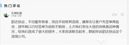 有网友对此评论称,“韵达快运,不仅服务极差,而且手段极其流氓,通常会让客户先签单再验货,损坏就以已经签单为由拒不赔偿,上次我们发往大连的货就是这种情况,给我们造成了很大的损失,大家应该联合起来,群起投诉韵达快运这个公司。”