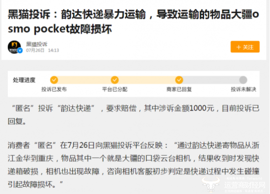 除了APP被查处,作为快递企业,韵达的被曝光量也惊人。7月26日,有用户在某投诉平台反映,“通过韵达快递寄物品从浙江金华到重庆,物品其中一个就是大疆的口袋云台相机,结果收到时发现快递箱破损,相机也出现故障,咨询相机客服初步判定是快递过程中发生碰撞引起故障损坏。”商家“韵达速递官微”7月26日在平台回复:“您好,已经将您的问题反馈给客服中心,请保持电话畅通!”随后再无下文。