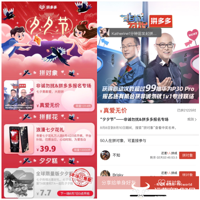七夕将至,新电商平台拼多多打造超级IP“夕夕节”,并联手非诚勿扰,跨界推出“拼对象”活动,受到了年轻用户热捧。8月3日-7日,在拼多多APP搜索框搜“拼对象”,即可参加活动。