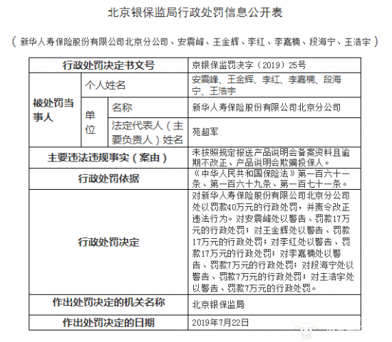 近日,新华人寿保险股份有限公司北京分公司(以下简称“新华保险北京分公司”)因违反《中华人民共和国保险法》相关条例,未按照规定报送产品说明会备案资料且逾期不改正、产品说明会欺骗投保人,银监会对此处以罚款40万元的行政处罚,并责令改正违法行为。
