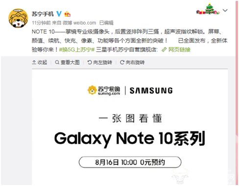 据悉,北京时间8月8日凌晨4点,三星在纽约召开Unpacked 2019发布会,带来了新款旗舰手机Note 10系列。整个系列有两款机型,分别为三星Note10以及三星Note10+。作为三星手机下半年的重磅产品,Note10系列一直备受关注,对于有购机需求的消费者可以持续关注苏宁手机,苏宁手机官微也是发布了这系列手机将于8月16日10:00在苏宁开启0元预约的信息。