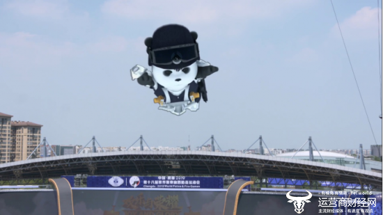 当你在观看直播时,会听到摩托车、消防车、警车的声音由远及近,突然一只熊猫骑着警用摩托从镜头下方腾空进入画面,围着场馆骑行一圈后停在了舞台中央。这时,场馆落下了漫天竹叶,只见熊猫腾空跃起,踩着竹叶,轻盈地奔向对面大屏上方,穿上远处飞来消防员套装,冲向空中,“嗖”的一下划过观众席,留下身后一道白光,现场闪耀着出现本届世警会的Logo。