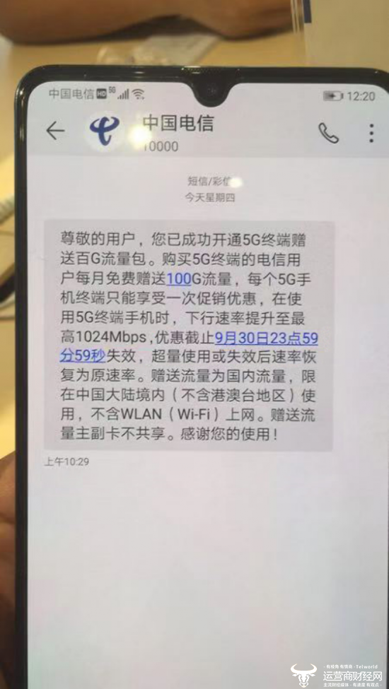 广东电信提醒称,用户在2019年8月10日至9月30日,凡购买5G手机的电信客户,可每月获赠100GB体验流量(5G体验速率最高可达1Gbps,流量有效期至2019年9月30日),每台手机每个号码只能领取一次。
