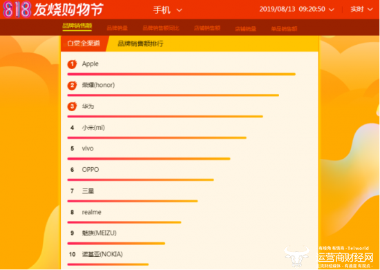 截止至8月13日,在苏宁818悟空榜上,品牌销售额全渠道排名前十的品牌分别为苹果、荣耀、华为、小米、vivo、OPPO、三星、realme、魅族和诺基亚。而在线下渠道手机品牌销售额前十名中,则是华为领衔榜首,苹果和荣耀分列第二第三。最终随着818终极爆发的到来,各家手机品牌谁将坐稳苏宁悟空榜榜首,争夺仍非常激烈,最终结果,拭目以待。