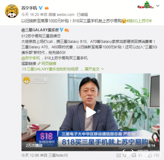 其中,三星电子大中华区移动通信部总裁严在勋在8月12日苏宁易购818三星品牌日当天,视频发声表示“818买三星手机就上苏宁易购”。据悉,苏宁易购818期间,三星拿出了大力度的优惠补贴,以旧换新最高补贴力度达到1000元,还可加入5G俱乐部,抢先换5G手机。