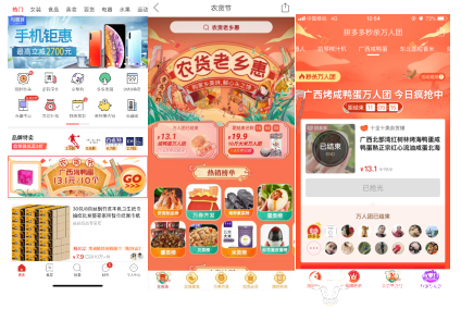 “很多新增用户是从农产品开始拼多多之旅的,买完三单,往往就能建立起信任感,接着买电器、手机等更高客单价的产品”,拼多多新农业事业部高级总监东原介绍,“作为一家技术驱动的互联网公司,拼多多主要通过商业模式创新,智能匹配供需,帮助农民把农产品顺利卖出去,让他们‘有产就有销,多劳能多得’”。如果说“多多果园”是通过产品开发来推动农产品上行,“农货节”就是拼多多从运营维度来推动农产品上行。