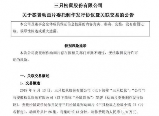 近日,三只松鼠与松鼠娱乐签署《动画片委托制作发行协议》,委托松鼠娱乐制作并发行三只松鼠系列动画片《三只松鼠之松鼠小镇2》(片名暂定)。这是三只松鼠第三次投资动画片,难道不满足植入广告的三只松鼠又开始“荼毒”小孩子了?