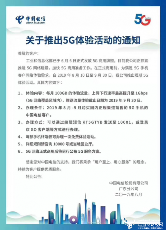 此外值得一提的是,为配合华为等首批5G手机的上市,广东电信在几天前还发布了5G免费体验方案,购买5G手机的电信用户,插卡开机后,将收到中国电信发送的5G服务短信,直接回复短信“KT5GTYB”(“开通5G体验包”首字母)就能体验电信5G,畅享最高1Gbps的5G高速率,体验期间享受每月赠送的100G大流量,体验期截止到9月30日。