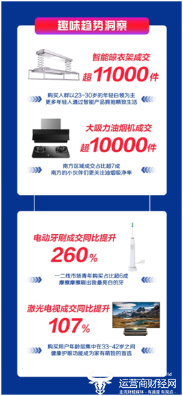 而家电消费也呈现出一些趣味趋势。在年龄层面,战报显示,智能晾衣架成交超11000件,购买人群集中于23—30岁的年轻白领,更多年轻人通过智能产品拥抱精致生活;激光电视成交同比提升107%,购买用户集中在33—42岁之间,健康护眼功能成为家有萌娃的首选。在地域表现上,大吸力油烟机成交超10000件,南方区域成交占比超7成,南方人更关注油烟吸净率;电动牙刷成交同比增长260%,一二线市场青年购买占比超过6成……