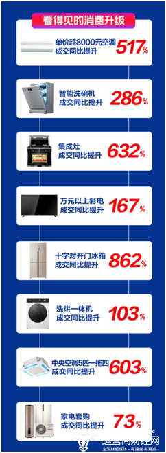 在消费市场,升级、换新成为两大关键词。依托全场景零售模式,苏宁成为高端品质家电的首选渠道。战报显示,单价超8000元的空调成交同比提升517%,智能洗碗机成交同比提升286%,集成灶成交同比提升632%,万元以上彩电成交同比提升167%,十字对开门冰箱成交同比提升862%,洗烘一体机成交同比提升103%,中央空调5匹一拖四成交同比提升603%,家电套购成交同比提升73%,用户的多元化需求带动消费市场升级加速度。