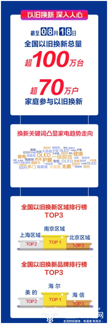 与此同时,苏宁818以旧换新再升级,全渠道迎来换新潮。截至8月18日,全国以旧换新总量突破100万台,超70万户家庭参与以旧换新。其中,健康、大容量、一级能效等成为换新关键词;南京、上海、北京成为全国以旧换新TOP3区域;海尔、美的、海信成为以旧换新TOP3品牌。