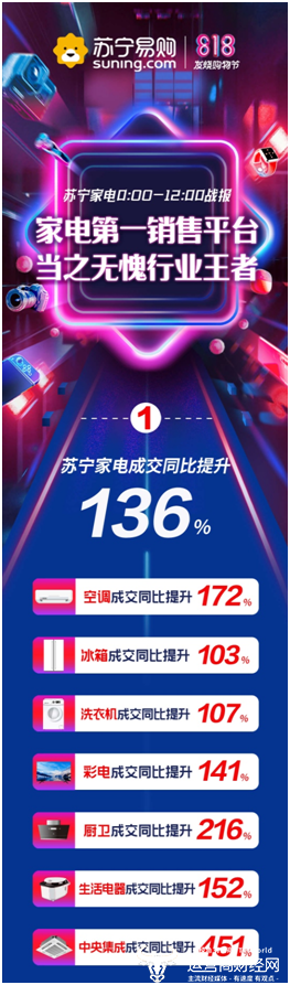 据苏宁大数据,截至当日12时,苏宁家电成交同比提升136%,各品类销售全面增长。其中,空调成交同比提升172%,冰箱成交同比提升103%,洗衣机成交同比提升107%,彩电成交同比提升141%,厨卫成交同比提升216%,生活电器成交同比提升152%,中央集成成交同比提升451%。