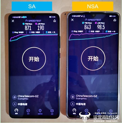 根据中国电信广东分公司最近的一次测试,使用机型是两部华为Mate 20X 5G版。从5G NSA/SA双模基站下,用户下行体验速率SA与NSA基本相当,网速是870mbps,比目前4G网络至少快5倍以上。