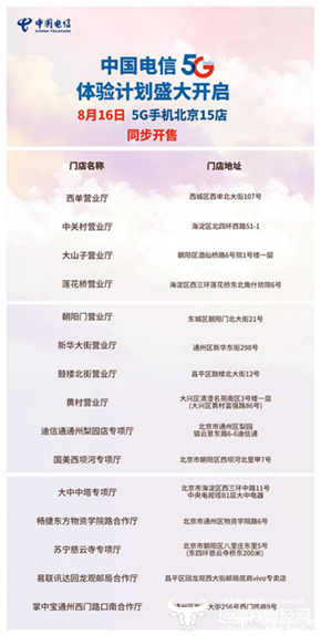 据运营商财经网了解,北京电信于前几日发布了“5G体验活动”,囊括了5G体验套餐、开通方式以及5G机型解读等多个方面。与此同时,北京电信的15家营业厅开放了5G体验区,用户可以前往免费进行体验。