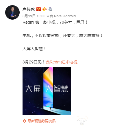 日前,小米集团副总裁、红米Redmi品牌总经理卢伟冰在微博上宣布,Redmi首款互联网电视将在8月29日推出,值得注意的是,荣耀也刚刚推出了首款自己家电品类的智慧屏产品,而这是否也预示着Redmi和荣耀的竞争再升级?