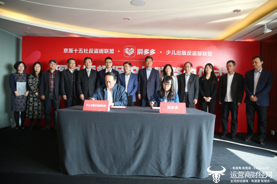 ▲2018年11月,拼多多与国内两大反盗版联盟——京版十五社反盗版联盟、少儿出版反盗版联盟签约合作仪式现场。全国政协文化文史和学习委员会副主任、中国版权协会理事长阎晓宏、国家版权局段玉萍副司长、上海市新闻出版局副局长蔡纪万、拼多多创始人及CEO黄峥等人及反盗版联盟成员单位代表们共同见证了签约仪式。