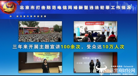 一直以来,北京电信都高度重视防范电信网络诈骗工作的开展。为积极响应工业和信息化部《关于纵深推进防范打击通讯信息诈骗工作的通知》、国务院打击治理电信网络新型违法犯罪工作第四次部际联席会议精神,北京电信携手北京市公安局刑事侦查总队开展了长期面向全社会的警企联合防诈骗公益宣传,积极开展各种形式的宣传活动,用发生在身边最真实生动的案例普及防诈骗的知识和技能。