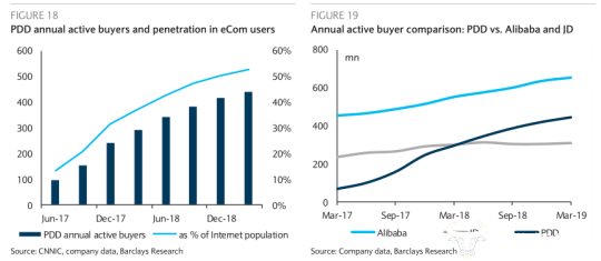 报告指出,作为一家成立不到四年的公司,拼多多的用户增长率令人印象深刻。就年活跃买家数而言,拼多多在2018年中期已上升至中国第二大电商平台(截至2019年3月)。