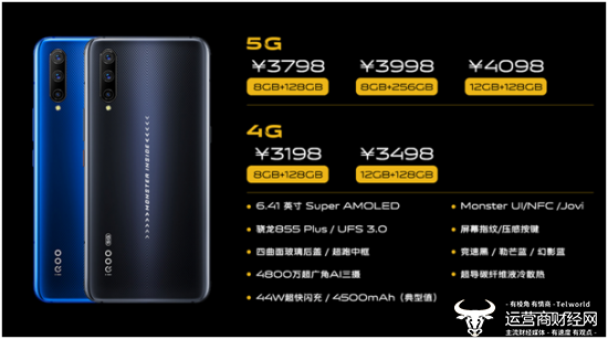 价格方面,价格方面,iQOO Pro共有多种版本可供选择:iQOO Pro 5G版提供8G+128G、8G+256G、12G+128G三个版本,价格分别对应3798元、3998元和4098元;iQOO Pro 4G版提供8G+128G、12G+128G两个版本,价格分别对应3198元和3498元。