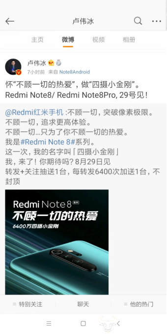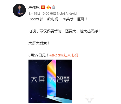 不仅如此,卢伟冰在微博上宣布,Redmi Note 8系列手机发布会上还将推出Redmi首款互联网电视,这意味着Redmi和荣耀的竞争再次升级。