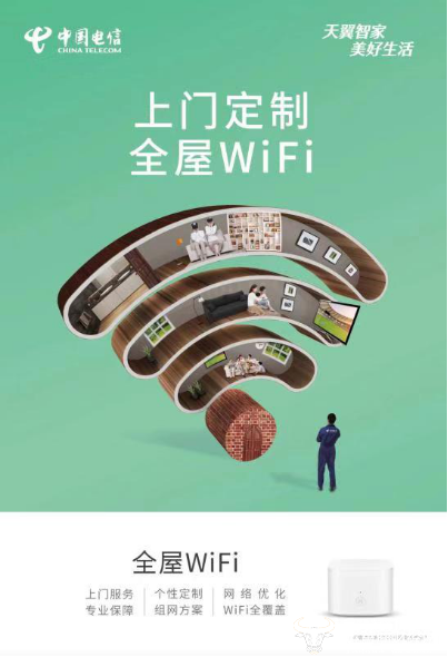 据了解,“全屋WiFi”是中国电信为了调优室内WiFi网络、提高宽带品质,精心打造的家庭网络优化服务,可以根据不同的房型制定个性化的无线组网方案,实现屋内网络无死角,WiFi全覆盖及最后1米连接,可实现WiFi的自动优化与无缝衔接,保证畅快上网不掉线。