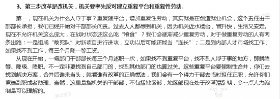 任正非在会议上说:“现在不允许机关这么庞大,在战时状态还这么吃“粮食”?我们会逐渐减少重复劳动,对于做重复劳动的人有两条出路:一是组成“敢列队”对新项目进行进攻,立功以后可能还能当“连长”:二是到内部人才市场找工作,如果找不到工作,每三个月降—等工资。”