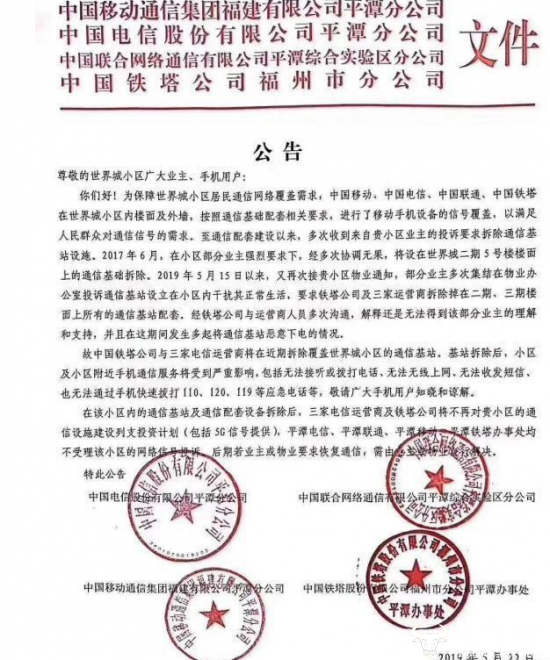 比如拆除基站一事。2017年,福建平潭当地三大运营商以及铁塔公司联合发布的一则公告引发了公众的关注,公告的内容如下: