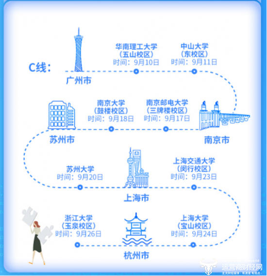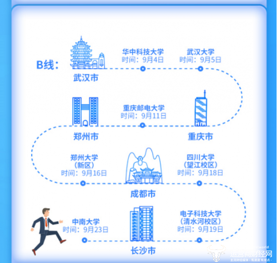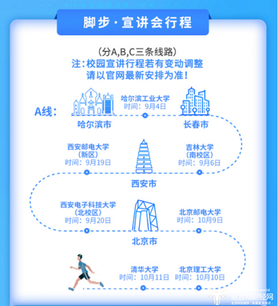 值得一提的是,此次中国电信2020年校园招聘分为了ABC三条宣讲线路,自9月4日开始,中国电信校园招聘团队将到全国20多个高校进行宣讲,想要报名参与校园招聘的小伙伴,可参考下方图片的宣讲城市和时间安排。