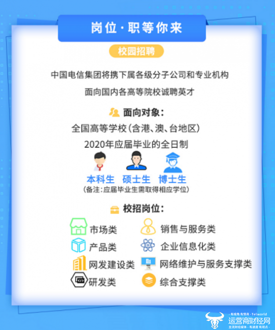 日前,运营商财经网获悉,中国电信已经开启了2020年校园招聘。作为三大运营商中最先出手的,“求贤若渴”、“唯才是举”是中国电信一贯的表现了。