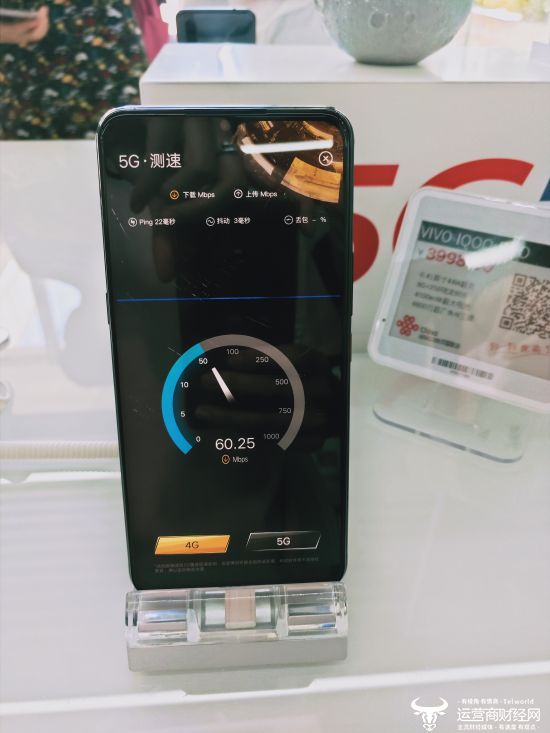 现场,记者拿起一款 iQOO Pro 5G手机感受到其机身非常的轻薄,且非常有质感,同时屏幕内还专门设置了5G体验入口,顺着这个入口点进去,里面有网络测速体验项目,因此记者选择了同一款手机分别对5G网络和4G网络进行网络测速,更直观的感受网速之间差距。