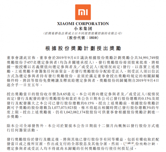 9月4号,小米集团宣布董事会根据股份奖励计划,共奖励457名选定参与者(均为非关连承授人)3499.1749万股股票。奖励员工股票是员工福利还是又有新动作,小米此番举动难道是为了平息日前股票动荡?