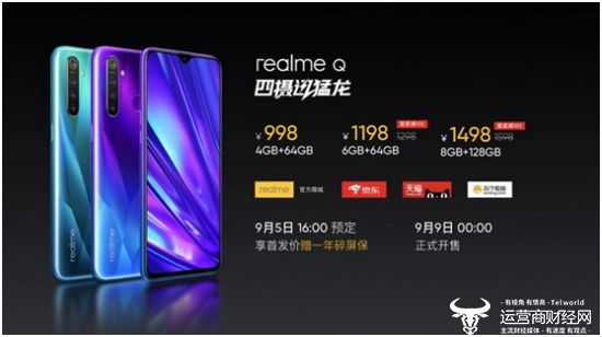 realme Q提供4GB+64GB \6GB+64GB \8GB+128GB \三个内存版本,4GB+64GB版本售价为998元,6GB+64GB和8GB+128GB版本首销立减100元,首销优惠价分别为1198元,1498元。目前,realme Q已在realme官网和京东、天猫、苏宁易购三大电商平台开启预购,并将于9月9日00:00正式发售。