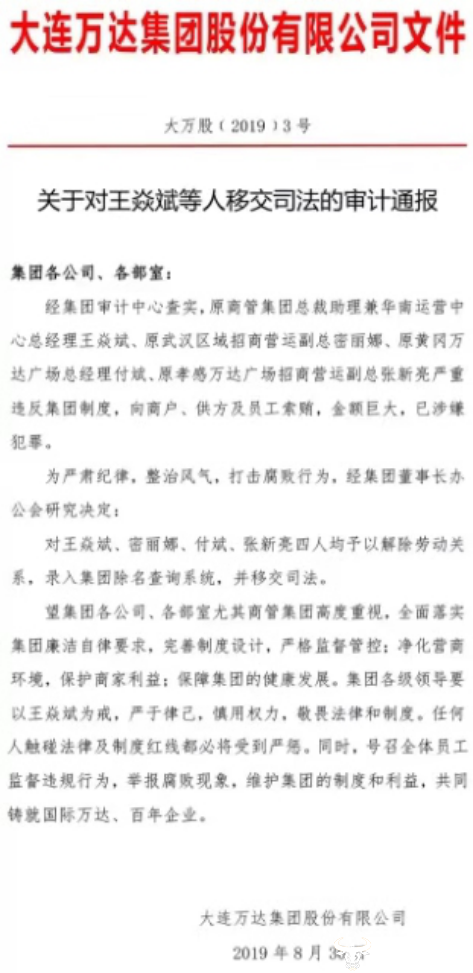 8月30日,万达集团内部发布《关于对王焱斌等人移交司法的审计通报》,目前,集团对王焱斌、密丽娜、付斌、张新亮四人均予以解除劳动关系,录入集团除名查询系统,并移交司法。