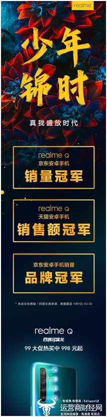 2019年9月9日,新锐智能手机品牌realme首款四摄产品——realme Q,在realme官方商城以及京东、天猫、苏宁易购三大电商平台同步正式开售。截至9月9日上午00:30,realme Q半小时内斩获京东安卓手机单品销量冠军、天猫安卓手机单品销售额冠军双平台冠军;更助力realme获得京东安卓手机销量品牌冠军。