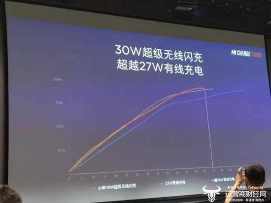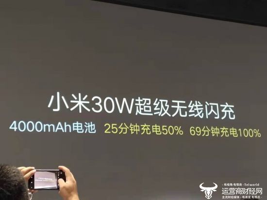 崔宝秋介绍称,小米将推出30W超级无线闪充,就拿4000mAh电池来说,25分钟可以无线充电50%,69分钟无线充电可以充满100%。