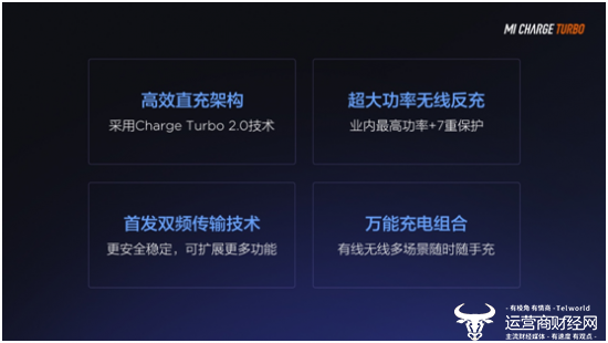 小米30W超级无线闪充内含四大技术创新,包括高效4:1直充架构、大功率无线反充、更加安全稳定的双频传输技术,以及结合有线OTG反充和大功率无线反充形成的万能充电组合。