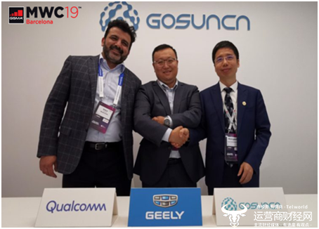 【图为2019巴塞罗那MWC展期间,高新兴与高通、吉利签署三方战略合作协议】