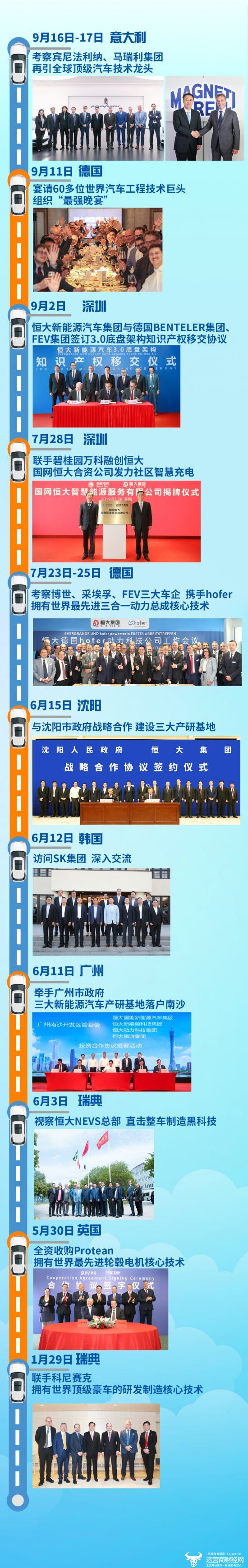 值得一提的是,这是许家印不到一周内第二次为恒驰扩大豪华造车朋友圈。在这之前,许家印在法兰克福举行大型答谢晚宴,宴请了60多位全球顶级汽车工程技术龙头企业、汽车零配件龙头供应商的董事长和CEO,其中包括博世集团、麦格纳、FEV集团等一流企业,为“恒驰”引入强援。