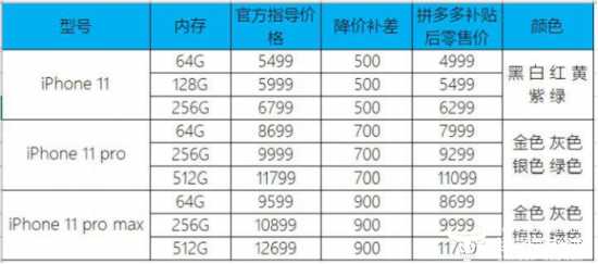 ▲iPhone 11系列手机价格对照表。拼多多补贴优惠券后的iPhone 11 Pro Max系列,与官方售价的iPhone 11 Pro系列一致。