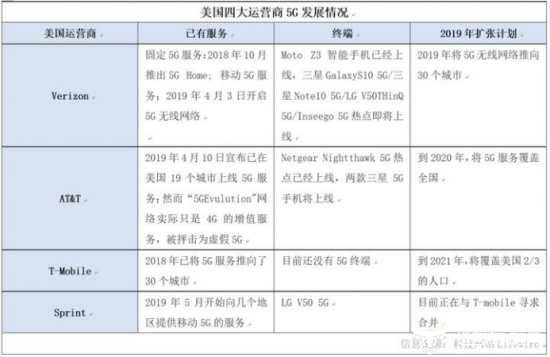 2019年4月, Verizon作为全球首发5G固网无线接入业务(私有标准),在芝加哥和明尼阿波利斯开启5G移动服务。 AT&T,Sprint和T-Mobile也在小范围提供5G服务。