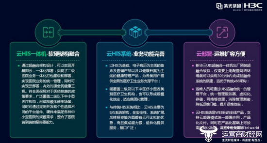 通过软硬架构的超融合设计,基于UIS 9000的县域医共体解决方案可以实现开箱即云的功能和便捷、高效的运维与扩容,支持二级及以下中医疗小型各类别医疗卫生机构业务的一体化建设和部署,全面承载以HIS为基础、电子病历为主线的临床和医辅产品以及以健康档案为主线的健康管理产品,从而为各类用户提供全面的医疗卫生业务支撑平台。