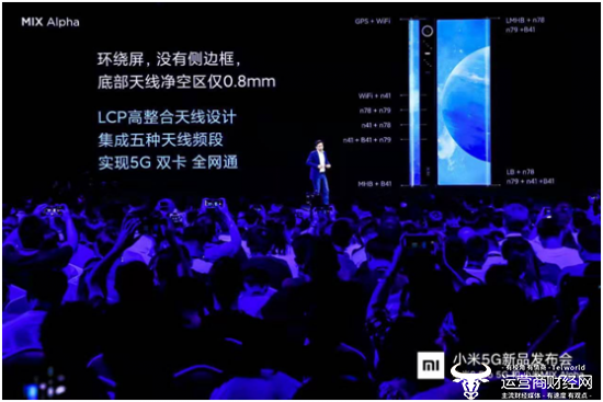 源于环绕屏幕设计,小米MIX Alpha 5G环绕屏概念手机利用屏幕发生技术产生超声波感应距离,没有的侧边框,底部天线净空区仅0.8mm,LCP高整合天线设计,集成五种天线频段,实现5G双卡全网通手机。