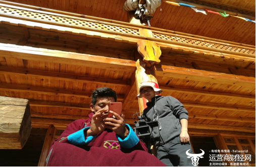 木里县利家咀村村民杜基在自家旅游驿站前使用手机与远在千里之外的客人聊天