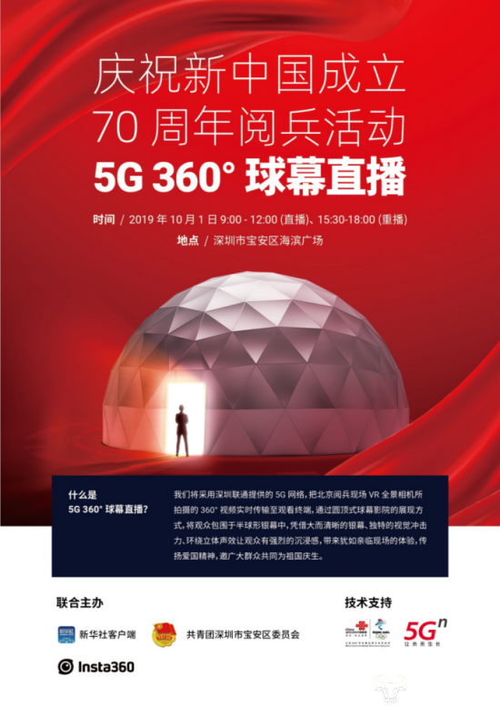 10月1日,庆祝中华人民共和国成立70周年阅兵活动将在北京进行。为了让市民更直观、更身临其境地体验阅兵活动,全方位感受祖国的强盛与繁荣,由新华社客户端、共青团深圳市宝安区委员会、Insta360(岚锋创视)联合主办、深圳联通提供5G网络技术支持的5G 360°球幕直播活动,将于10月1日在深圳市宝安区海滨广场举办,面向广大市民限时免费开放。