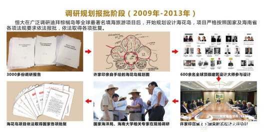 恒大广泛调研了迪拜棕榈岛、荷兰弗莱福兰岛等全球著名填海旅游项目,开始对海花岛进行构思、规划和设计,并严格按照国家各项法规要求依法报批,于2012年先后取得国务院的海洋功能区划批复、国家海洋局的区域建设用海规划批复、用海规划海洋环境审查批复,2013年取得填海指标批复。